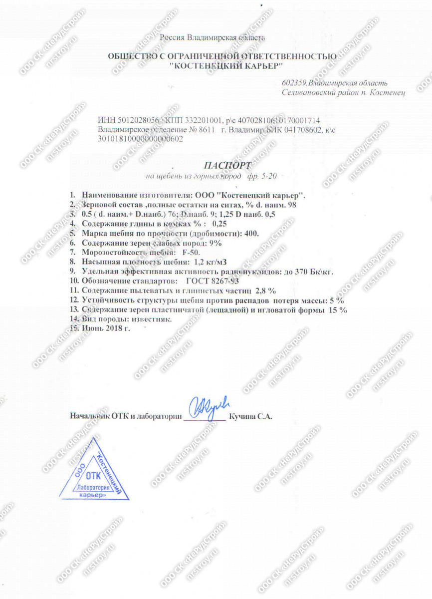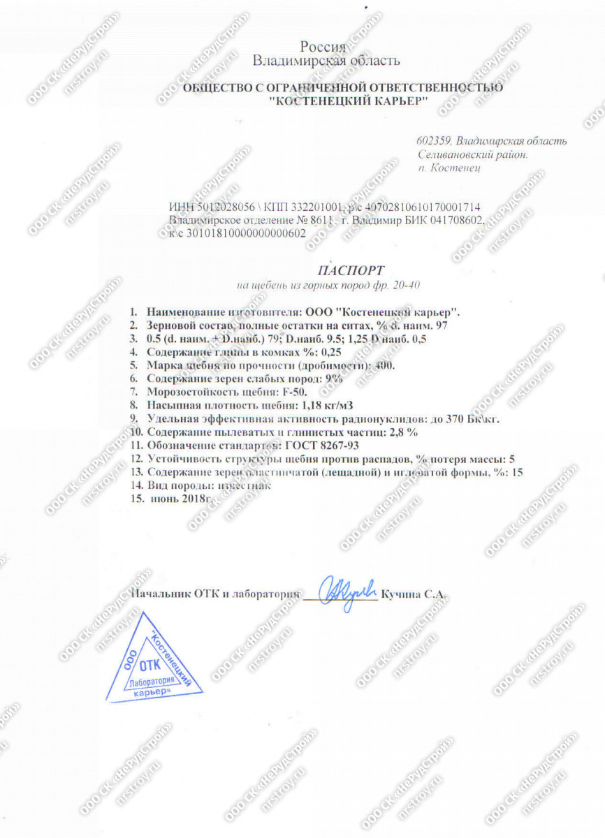 Поставляем щебень известняковый (фракции 5-20, 20-40, 40-70) ООО "Костенецкий карьер", соответствующий ГОСТ 8267-93. Есть подтверждающая документация: